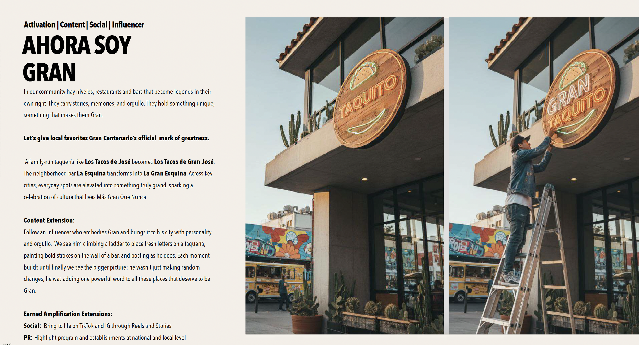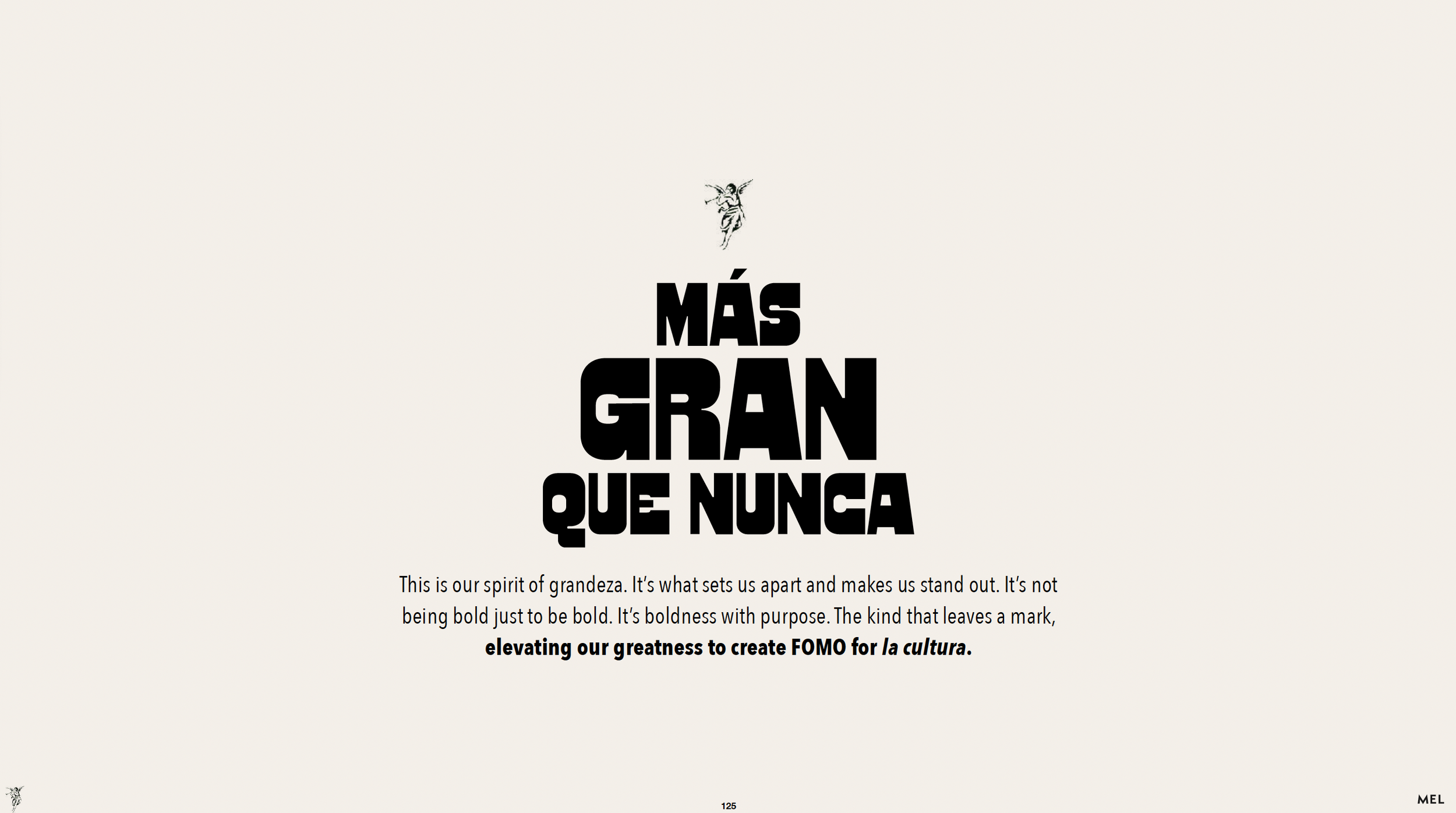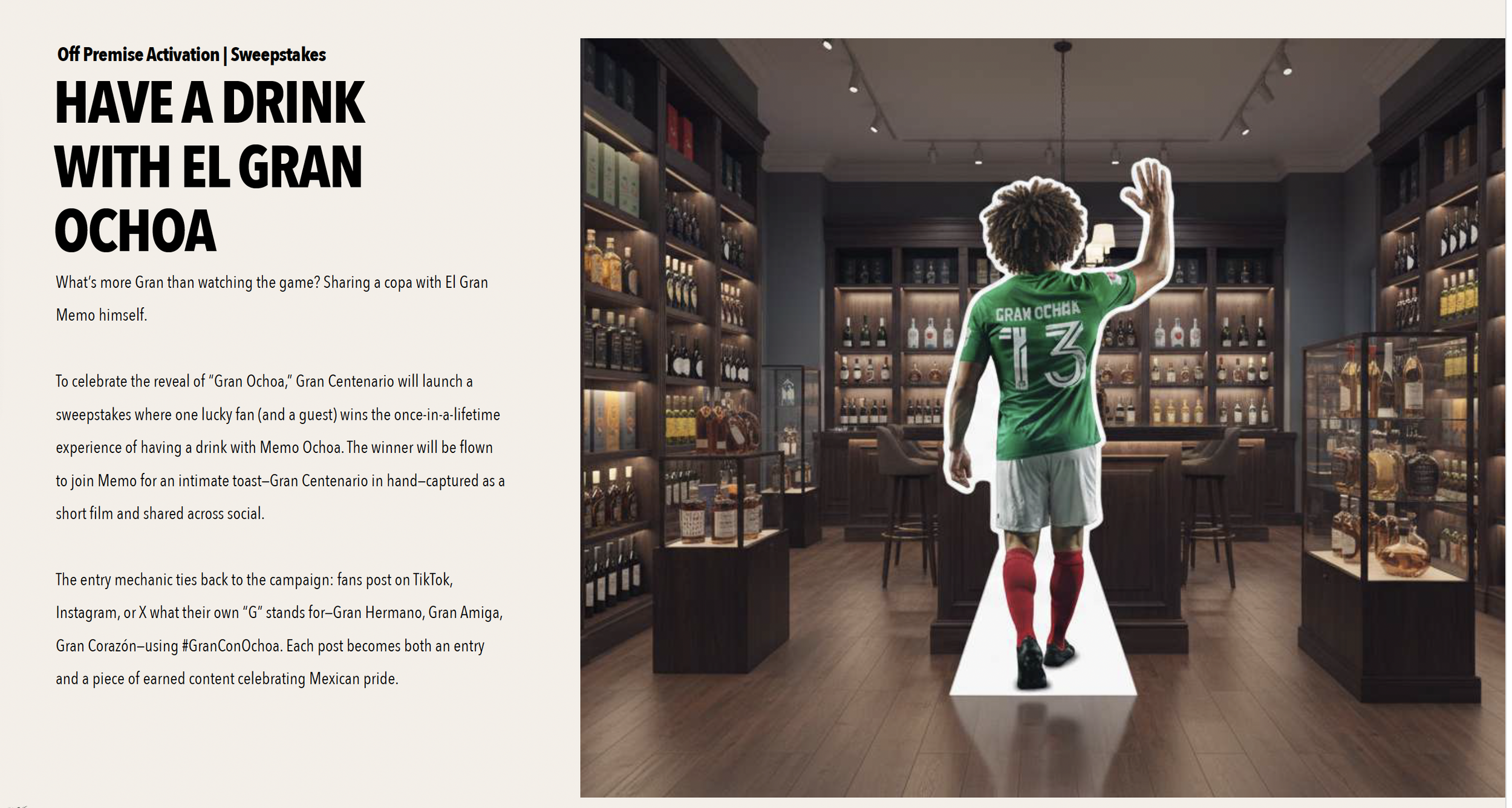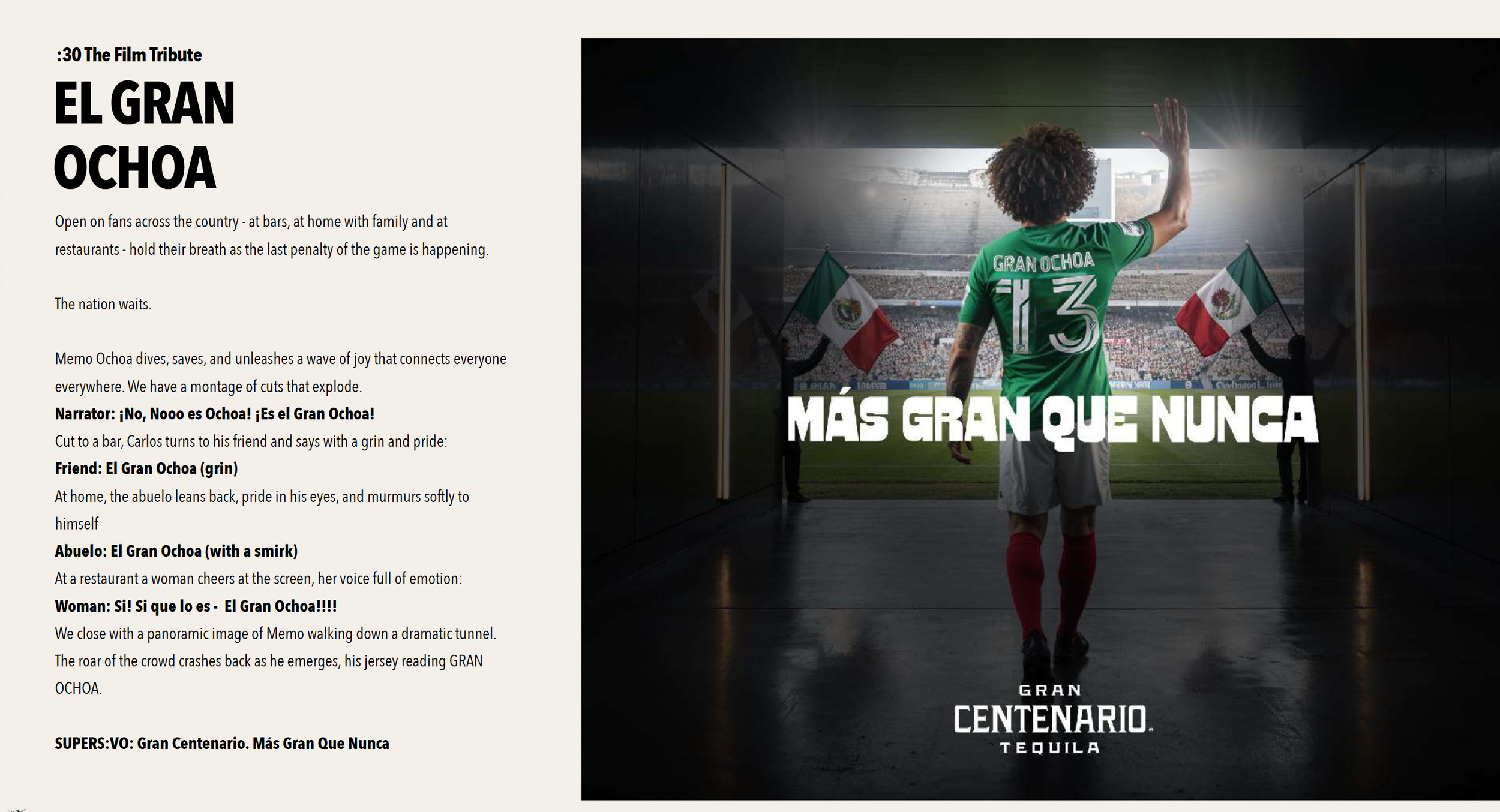 I THINK THIS IS A GOOD SAMPLE OF HOW I CAN INTERPRET A BRAND’S SOUL AND SPIRIT, AND THEN TURN THAT INTO ITS VOICE. AS YOU’LL SEE IN THE DECK, WE LANDED ON A CONCEPT AND WENT FROM SCRATCH VISUALLY, WRITING MANIFESTOS, HEADLINES, TV, SOCIAL, AND EVEN EARNED MEDIA IDEAS (THAT THEY ARE PRODUCING FOR THE WORLD CUP, SO I PROBABLY SHOULD TAKE IT DOWN AFTER OUR MEETING 😅). THERE IS MORE ABOUT THIS PROJECT, BUT YOU’LL SEE IT IN THE NEXT CHAPTER AT 3PM.