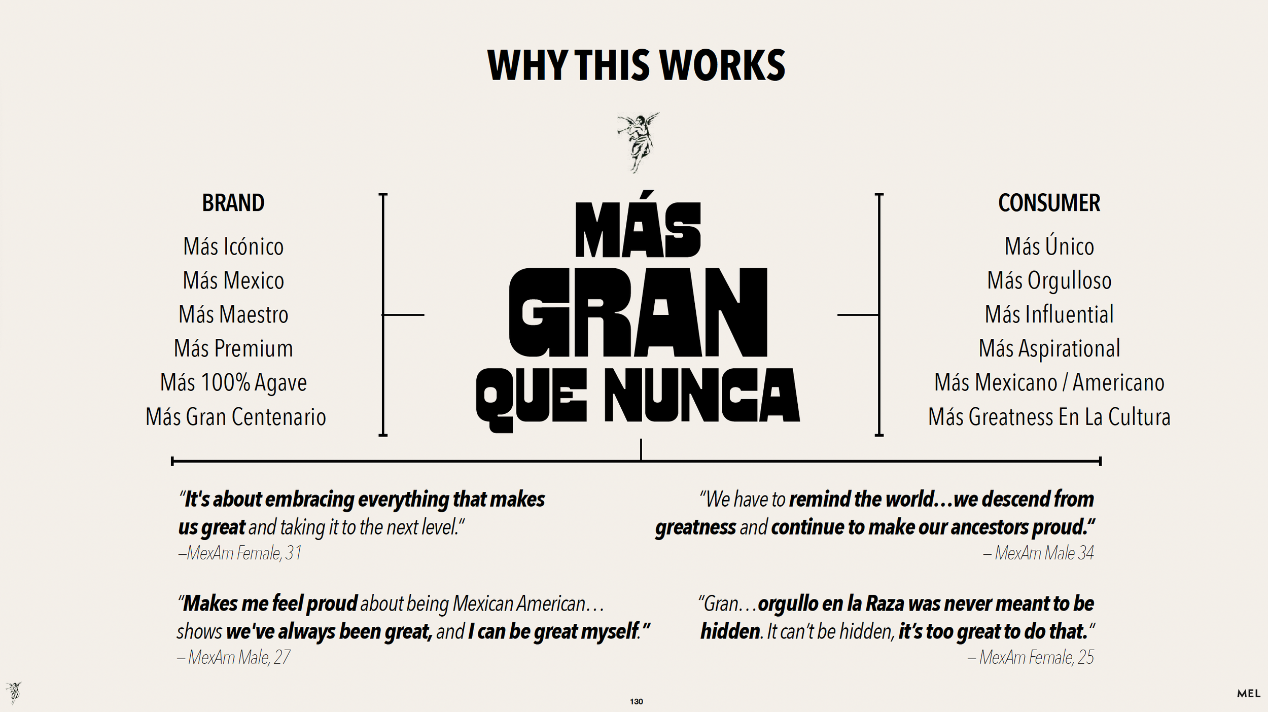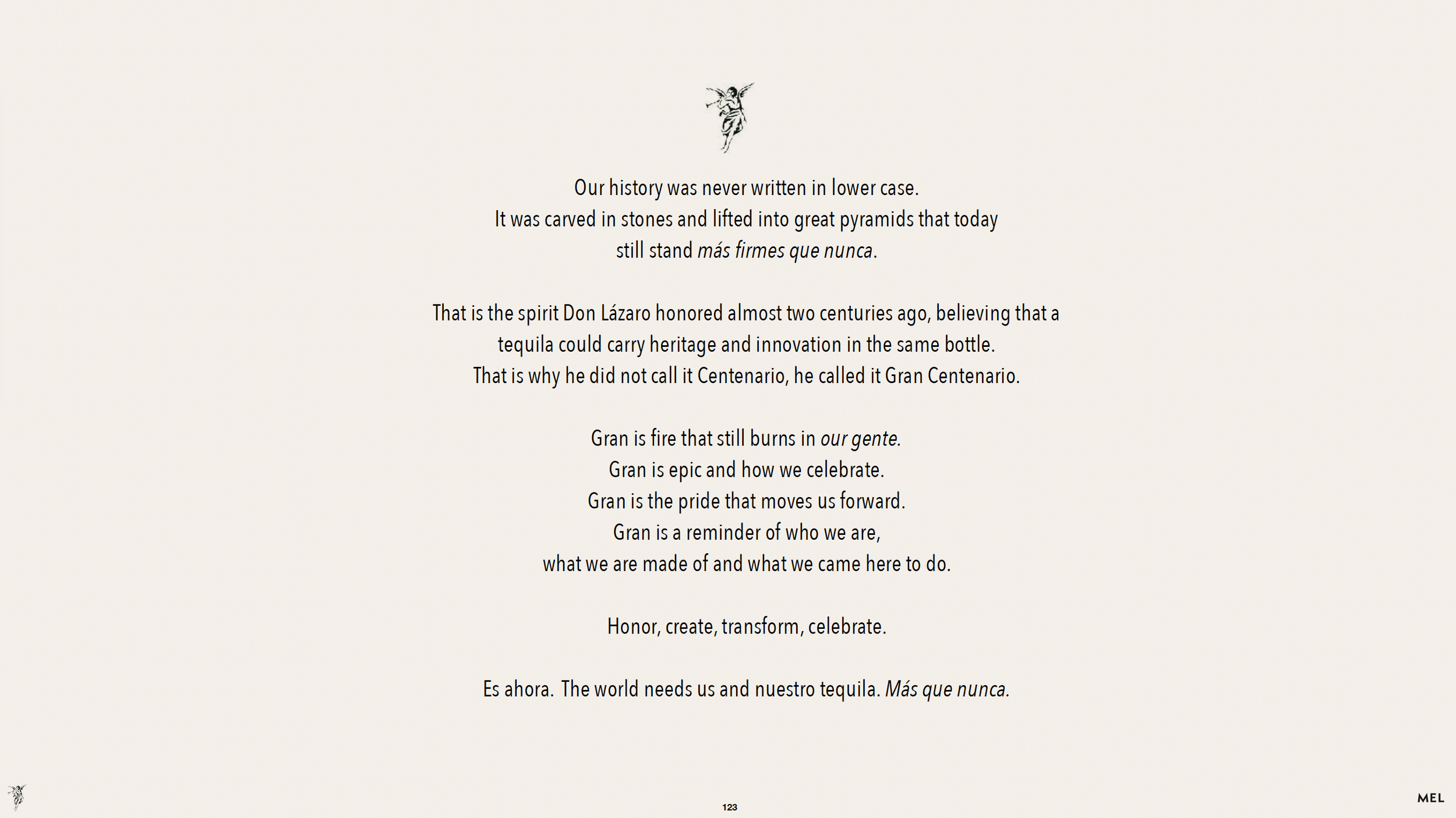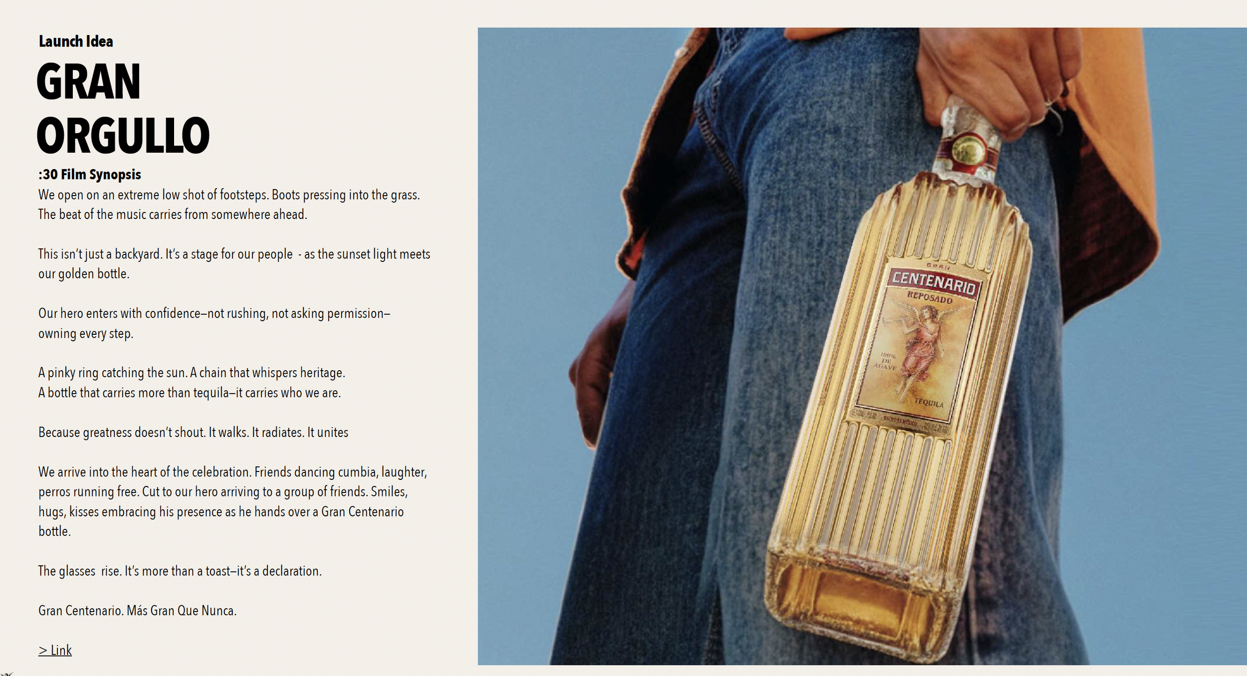 I WAS REVIEWING MY OWN BOOK AND I THOUGHT, “HEY, THIS IS COOL, BUT IT’S VERY CONCEPTUAL.” AND SINCE WE’LL BE WORKING ON BRANDING AND DESIGN, I WANT TO SHOW ALI THAT I CAN WRITE. SO I DECIDED TO INCLUDE THIS RECENT PITCH DECK (THAT ACTUALLY WON THE PITCH, GO ME!) FOR TEQUILA GRAN CENTENARIO.